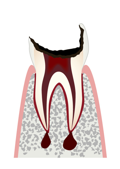 歯根の部分までむし歯菌が侵入し、歯の大部分は溶けて崩れ、末期のむし歯の状態です。この段階では痛みを感じる神経自体が壊死しているため痛みを感じません。しかし放置するとやがて歯根部に膿がたまり激痛を生じやすくなります。麻酔も効きにくく、歯を残存することも難しくなります。